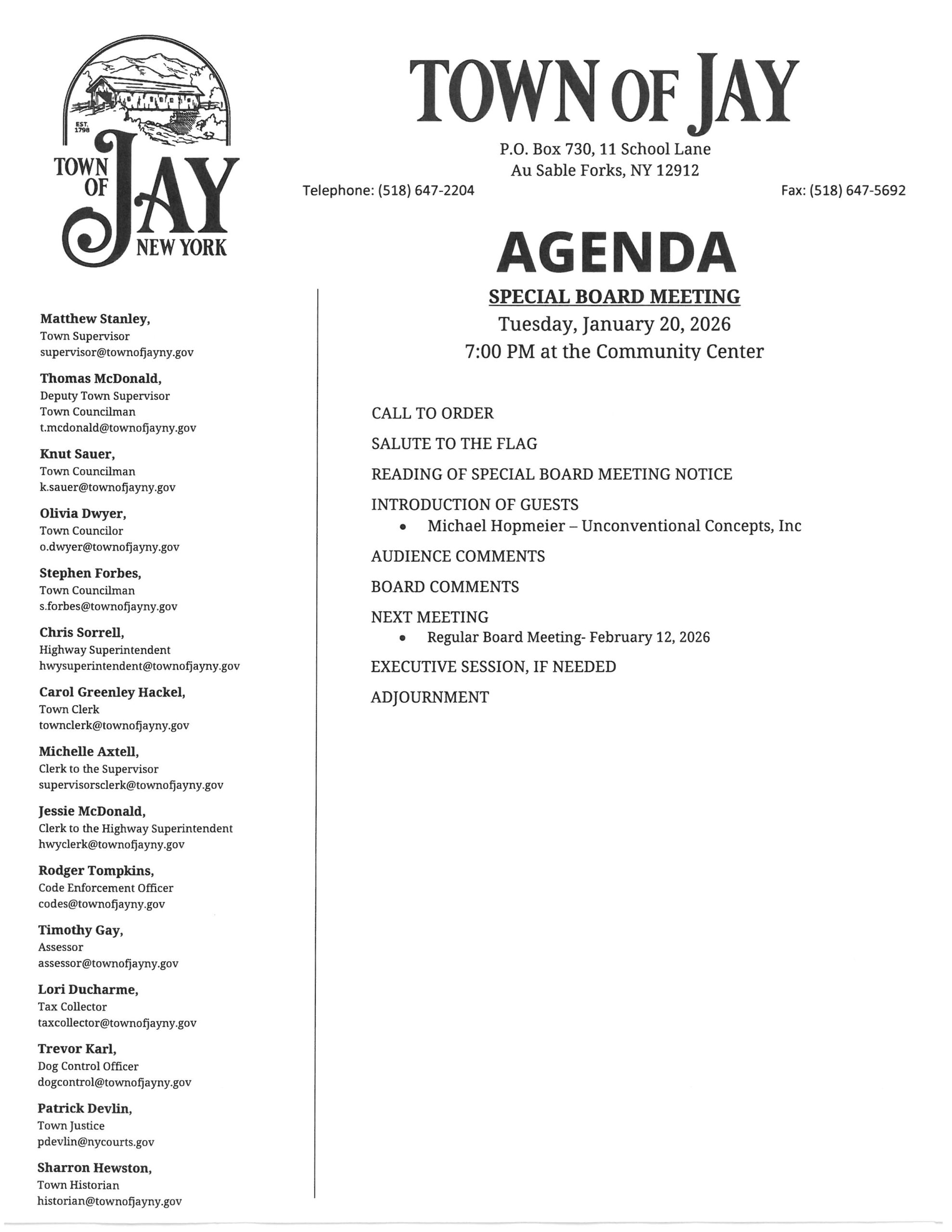01/20/2026: Special Board Notice – Agenda – Minutes – Video