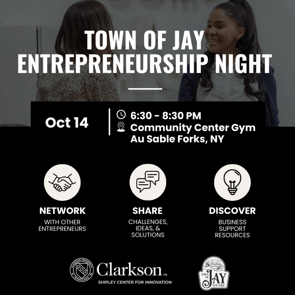 The Shipley Center for Innovation at Clarkson University, in collaboration with the Town of Jay, is hosting an Entrepreneurship Night at the Community Center on Tuesday, October 14 from 6:30 to 8:30 PM. This event offers an excellent opportunity for local entrepreneurs, small business owners, and innovators to network and learn about valuable resources to support their business journey.