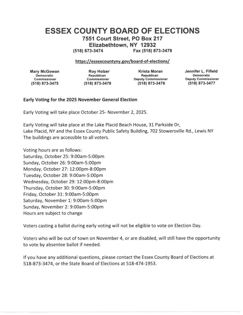 The Essex County Board of Elections is seeking poll workers for the upcoming election. They are specifically looking for Republican and Independent individuals. If you are interested in helping your community during this election, please reach out to the Essex County Board of Elections Office in Elizabethtown.