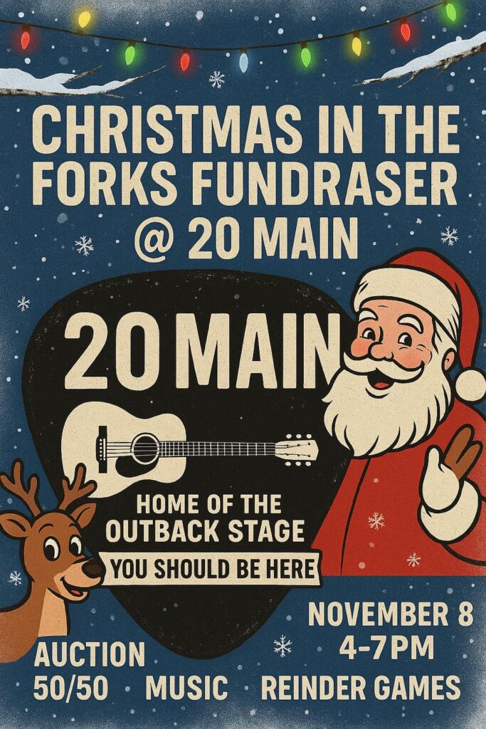 This year’s Christmas in the Forks Fundraiser will be held tomorrow, Saturday, November 8 at 20 Main beginning at 4:00 pm. The event will feature a silent auction, 50/50 raffle, music, and “Reindeer Games.”