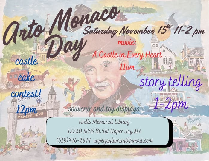 Celebrate the birthday of Arto Monaco on Saturday, November 15, from 11:00 a.m. to 2:00 p.m. at the Wells Memorial Library in Upper Jay, just across the river from the famous Land of Make Believe. The event will feature a Castle Cake Contest to show off creative baking skills, stories from those who worked at the Land of Make Believe as young teens, and exhibits showcasing Arto Monaco’s whimsical artwork. This family-friendly event honors the legacy of one of the Adirondacks’ most beloved creative minds.