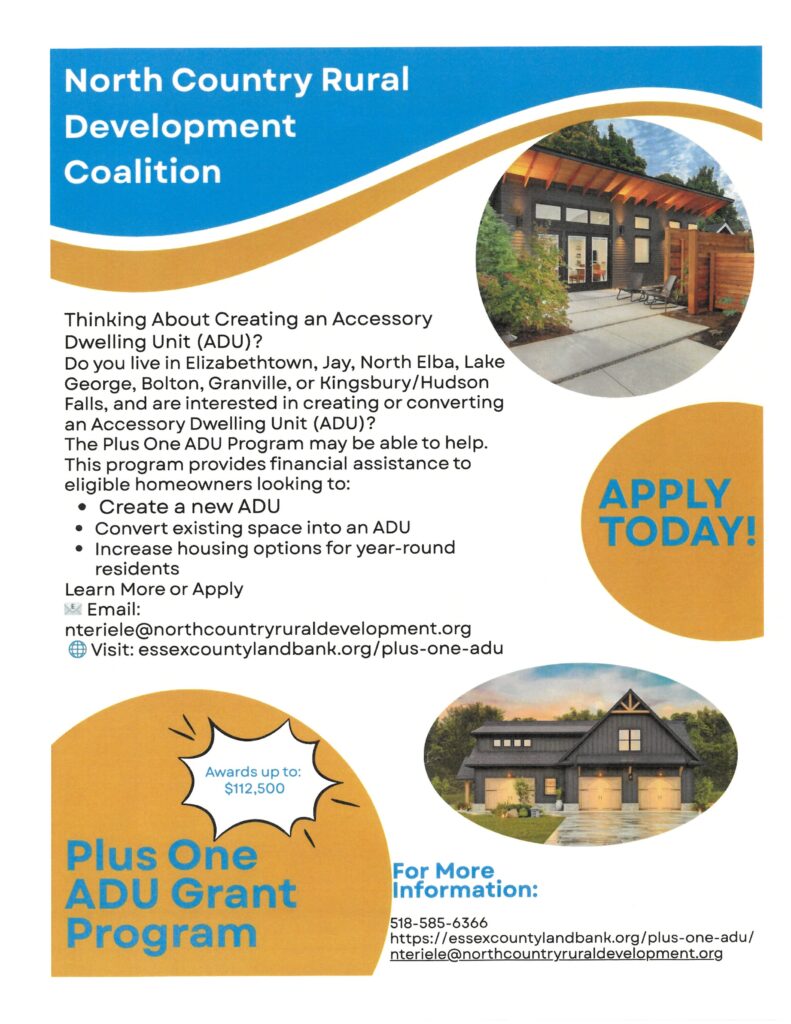 To learn more or to apply, please contact Nicki teRiele at nteriele@northcountryruraldevelopment.org or visit https://essexcountylandbank.org/plus-one-adu/.