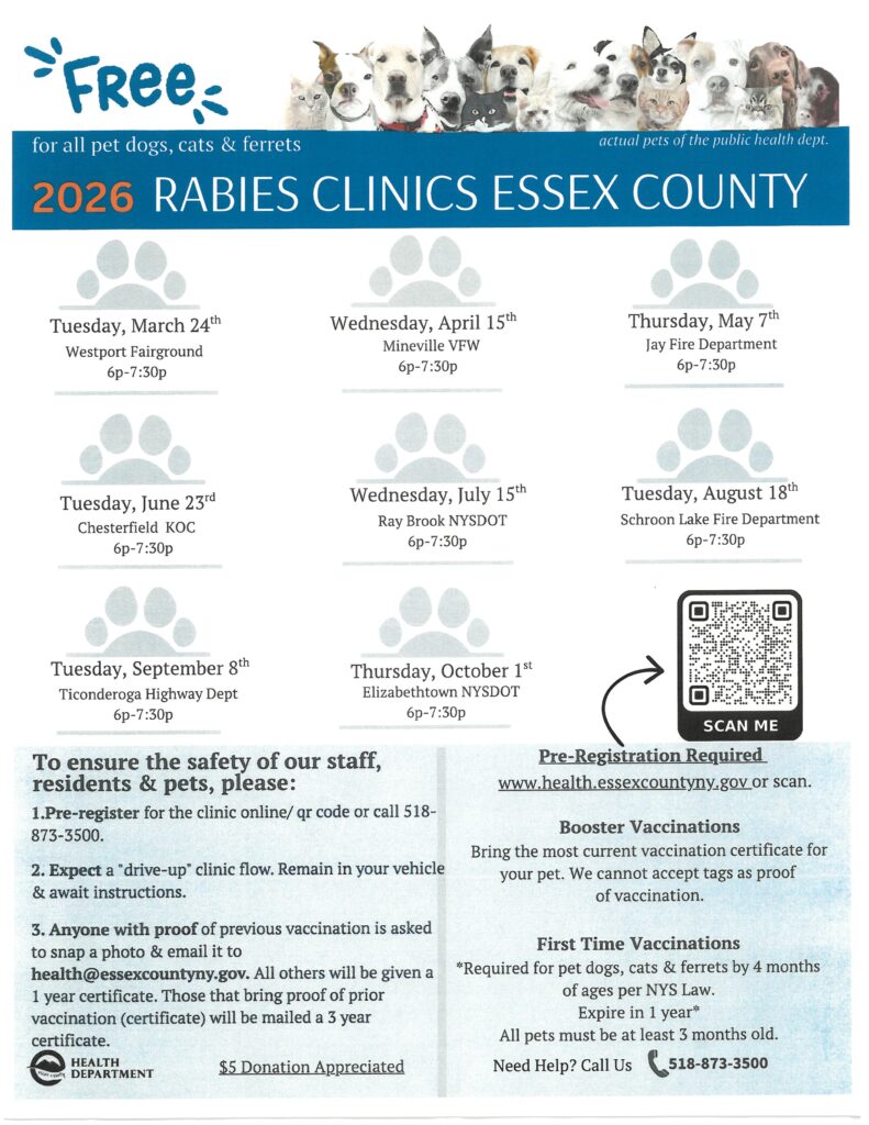 The Essex County Health Department will hold a free rabies vaccination clinic on Thursday, May 7 from 6:00 pm to 7:30 pm at the Jay Fire Department as part of its 2026 countywide clinic schedule. Pre-registration is required at https://health.essexcountyny.gov or by calling 518-873-3500. The clinic will follow a drive-up format, and pets must be at least three months old. Owners seeking a booster must bring a current vaccination certificate, as tags are not accepted. A $5 donation is appreciated to support the program.
