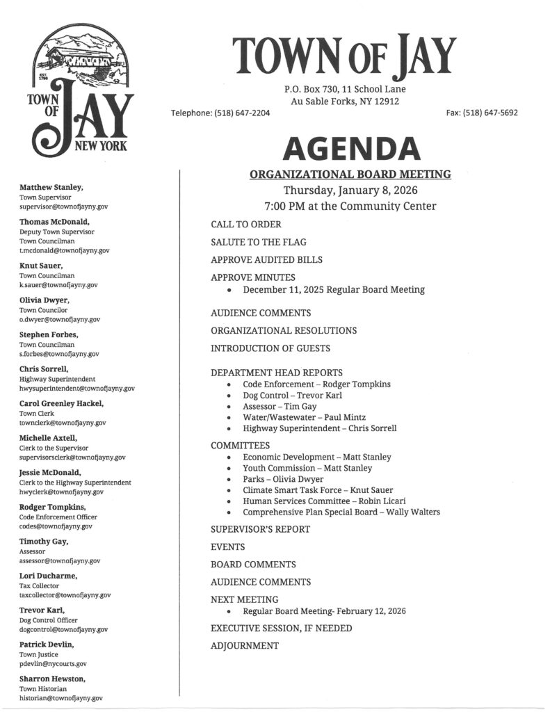 On Thursday 1/8, the Town of Jay Board will be holding their 2026 Organizational Board Meeting. The agenda is posted below.