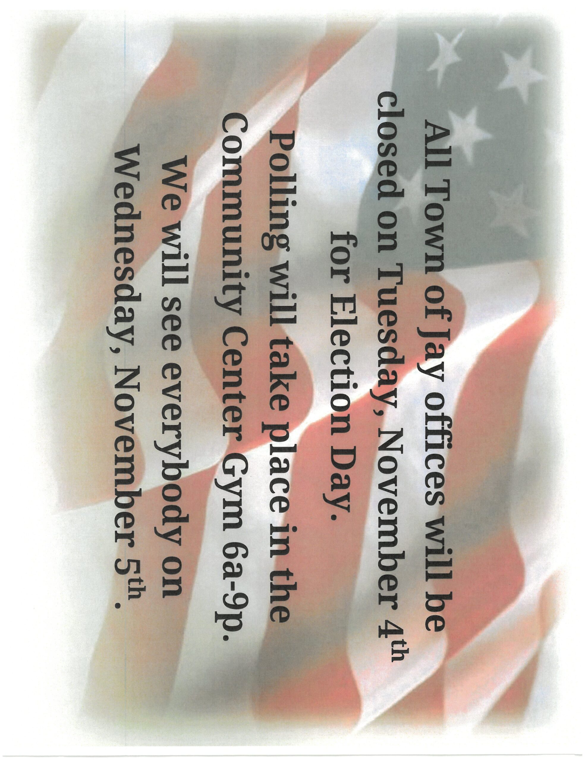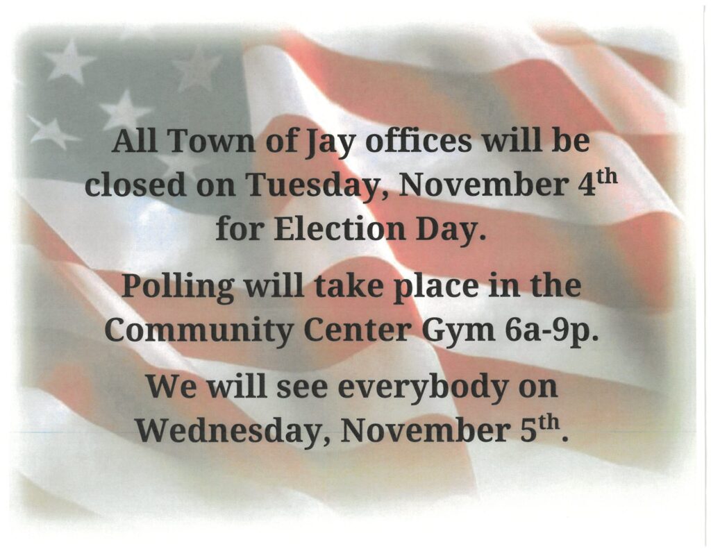 All Town of Jay offices will be closed on Tuesday, November 4th for Election Day. Normal business hours will resume on Wednesday, November 5th.