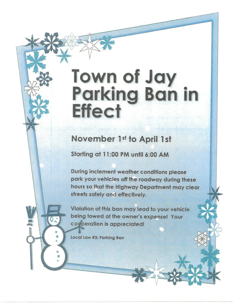 A parking ban will be in effect from November 1st through April 1st during the overnight hours – 11PM to 6AM. In the event of inclement weather, please park your vehicles off the roadway during these hours to allow the Highway Department to safely and effectively clear the streets. Thank you for your cooperation.