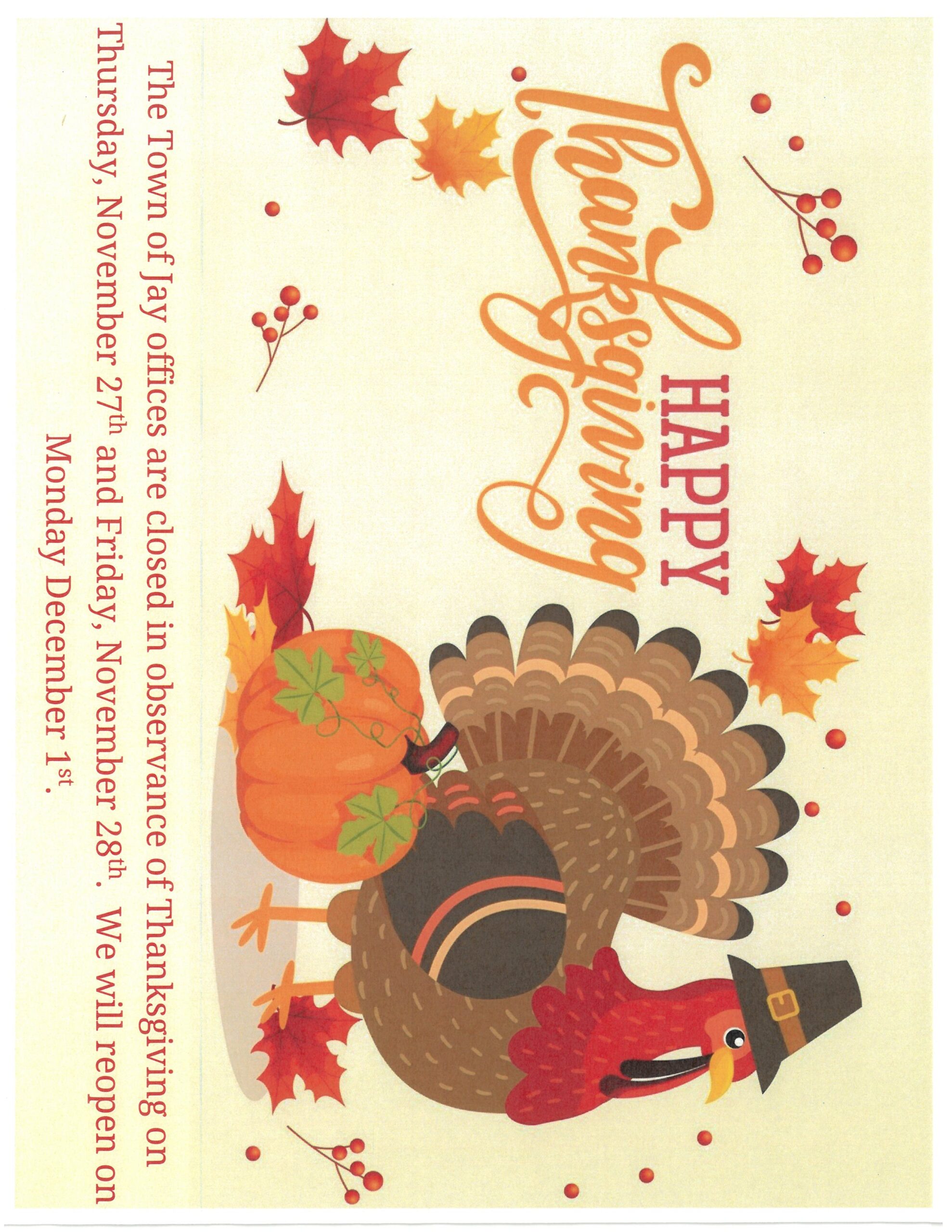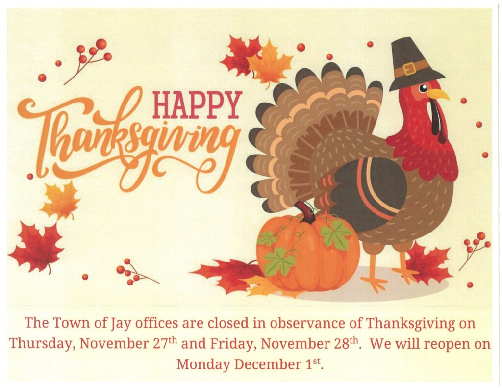 Town of Jay – Thanksgiving Office Hours In observance of Thanksgiving, The Town of Jay offices will be closed on Thursday, November 27th and Friday, November 28th. Normal business hours will resume on Monday, December 1st. We hope everyone has a wonderful holiday! By MichelleAxtell|2025-11-25T10:05:14-05:00November 25, 2025|Office Hours Updates|0 Comments
